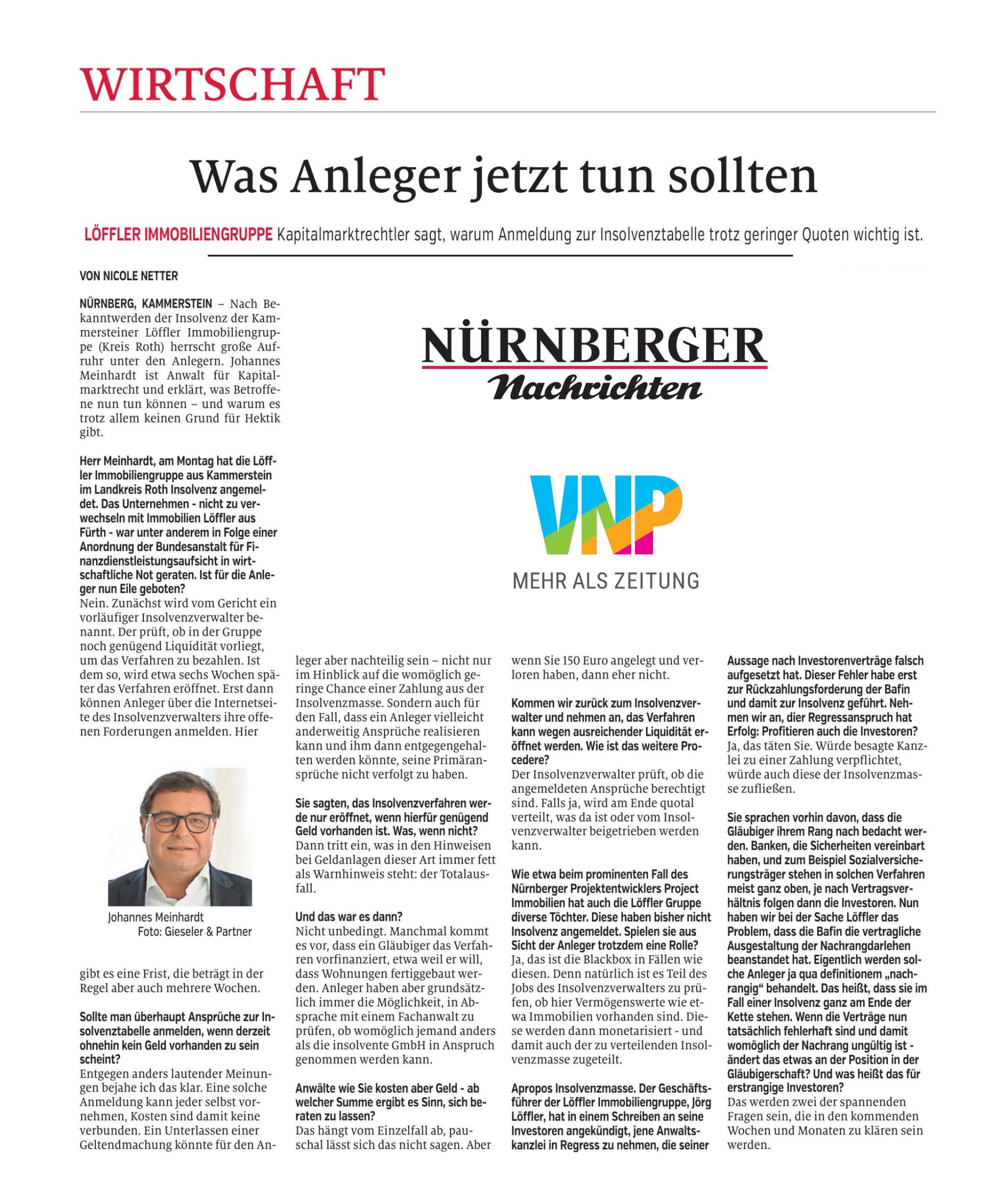Die Löffler Immobiliengruppe GmbH ist insolvent. Die BaFin hatte bereits mit Bescheid vom 29.07. angeordnet, dass die Löffler Immobiliengruppe es zu unterlassen hat, gewerbsmäßig unbedingt rückzahlbare Gelder im Rahmen qualifizierter Nachrangdarlehen zu vereinnahmen, ohne dass diese in Inhaber-/Orderschuldverschreibungen verbrieft waren. Dass Anleger auch im Angesicht des drohenden Totalverlusts nicht passiv bleiben sollten, durfte unser Kollege Johannes Meinhardt im Interview mit den Nürnberger Nachrichten erläutern: